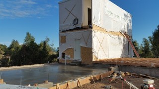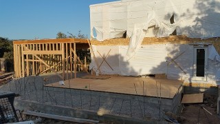 We’re halfway through our project. The upstairs floor joists have been installed and covered. Also, the concrete front/entry patio has been poured. |