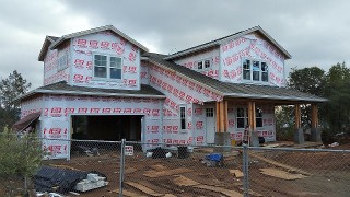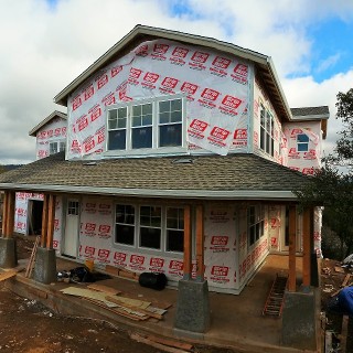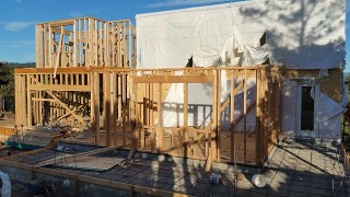 The house is wrapped. The doors and windows are in; as are the trim and gutters. Now that the house is greatly protected; inside work in the non-cores can begin. |