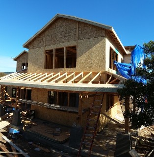 Most of the roof has been sheeted; and the front porch has been framed with truss tails put in place above. |